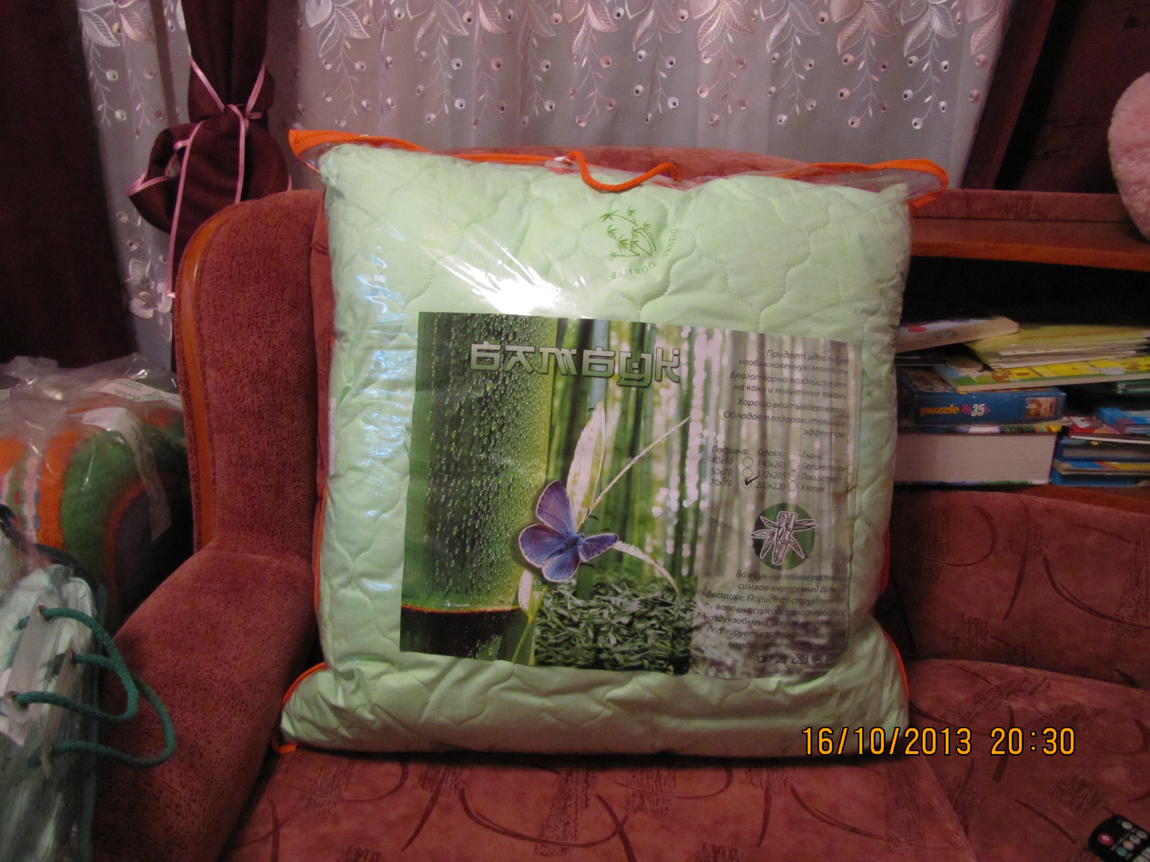 Подушка "Бамбук" 50х70 (леб пух тик, сатин-100% хл, натуральный бамбук) 360 рублей.