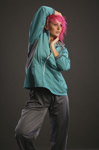 Изделие из эласта (начесного полиэстера). Костюм находка для женщин с пышными формами. Очень удобный костюм, свободного кроя куртка и брючки позволяют не стеснять движения. Вставки на куртке в цвет брюк позволяют визуально удлинить силуэт. Белый кант и печать на груди всегда придают нарядный вид изделию. У куртки карманы на молнии, в брюках прорезные карманы.