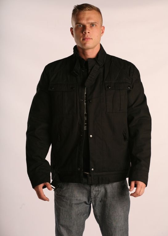 Тип материала: изделия из смесовой ткани. Укороченная куртка, на молнии с дополнительными клёпками, на воротнике дополнительная застёжка, два верхних кармана и два нижних кармана. Демисезонная модель.
