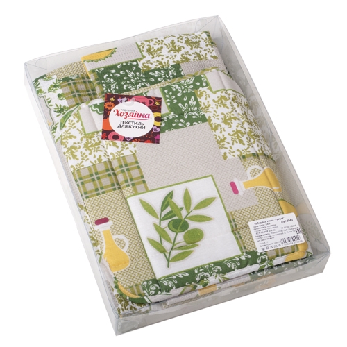 В состав набора входит: изделия из бязи пл. 125 гр./кв.м. с наполнителем синтепон: стеганая рукавичка- прихватка 30х17 - 1 шт., прихватка квадратная 18х18 - 2 шт., текстильная ваза 18х18 - 1шт.; изделия из вафельного полотна пл. 165 гр./кв.м.: полотенце 40х70 - 4 шт. Бязь - хлопчатобумажная плотная ткань, обладает износостойкостью, низкой сминаемостью. Синтепон экологически безопасный материал, износостойкий с хорошими гигиеническими свойствами. Вафельное полотно отличается высокой впитываемостью и износоустойчивостью.