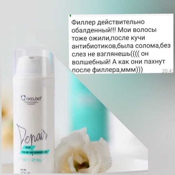 Филлер с растительными протеинами проникает в структуру волоса, заполняя пустоты и повреждения, обволакивая каждый волос. При регулярном использовании заменяет такие популярные салонные процедуры, как ламинирование и кератиновое выпрямление. Масло авокадо и экстракт листьев оливы увлажняют и питают волосы, придают эластичность и сияние. Волосы становятся гладкими, глянцевыми, здоровыми и ухоженными.