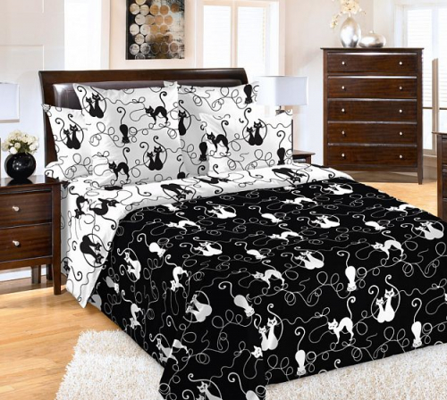 Простыня (черная с кошками) 2 сп и наволочки (белые с кошками) 70*70 2 шт.